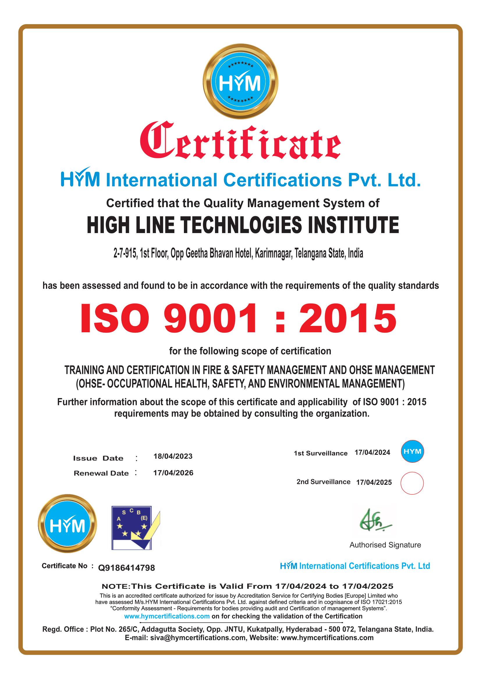Highline Fire and Safety Training Institute is an ISO 9001:2015 certified institution dedicated to excellence in fire and safety education. Located in Karimnagar, Telangana, we offer comprehensive training solutions to meet national and international safety standards. With experienced trainers, state-of-the-art facilities, and a strong focus on industry requirements, we have established ourselves as a leader in the field.